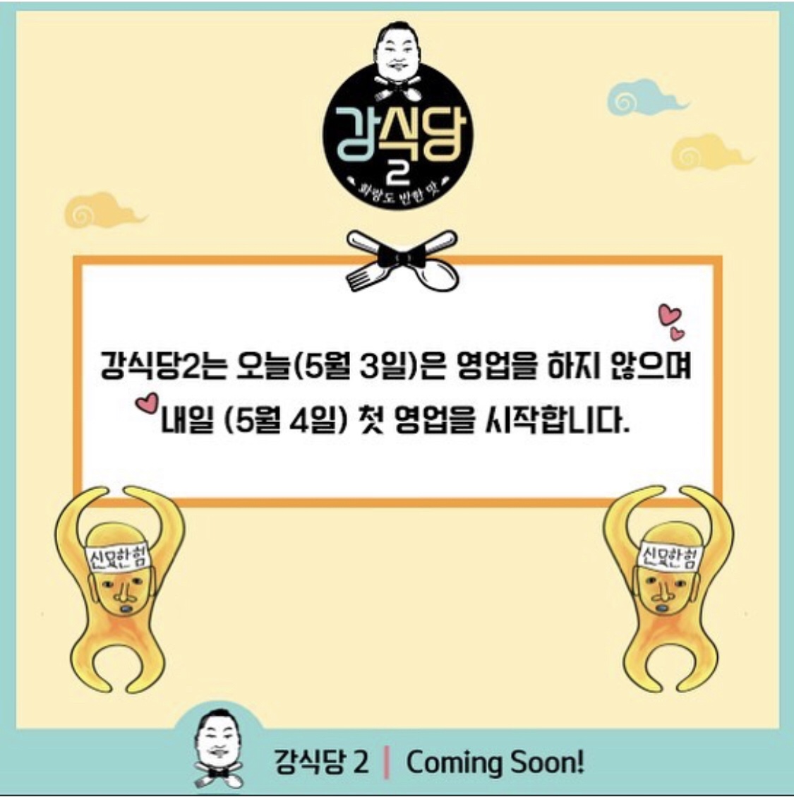 제작진에 따르면 강식당 2는 내일 5월 4일 토요일부터 영업을 시작한다고 합니다.